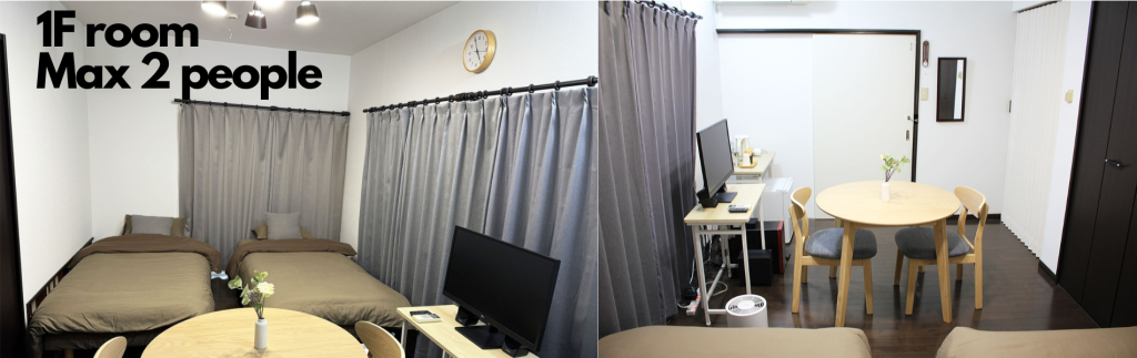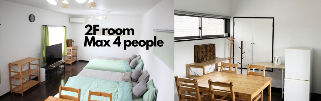 - 宿泊室は1階の離れ部屋1室(最大2名)と2階のワンフロア1室(最大4名)の2部屋でして、各部屋とも隣の部屋はありませんので独立性があります。1階と2階の部屋で最大計6名までご宿泊可能です